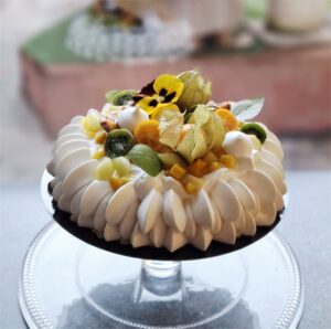 Meringue, crème fouettée, fruits exotiques.