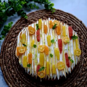 Fond de tarte amande / crème d’amande zt zestes d’agrumes / curd crémeux orange et citron / gel citron vert / meringue fondante / Suprêmes d’agrumes.